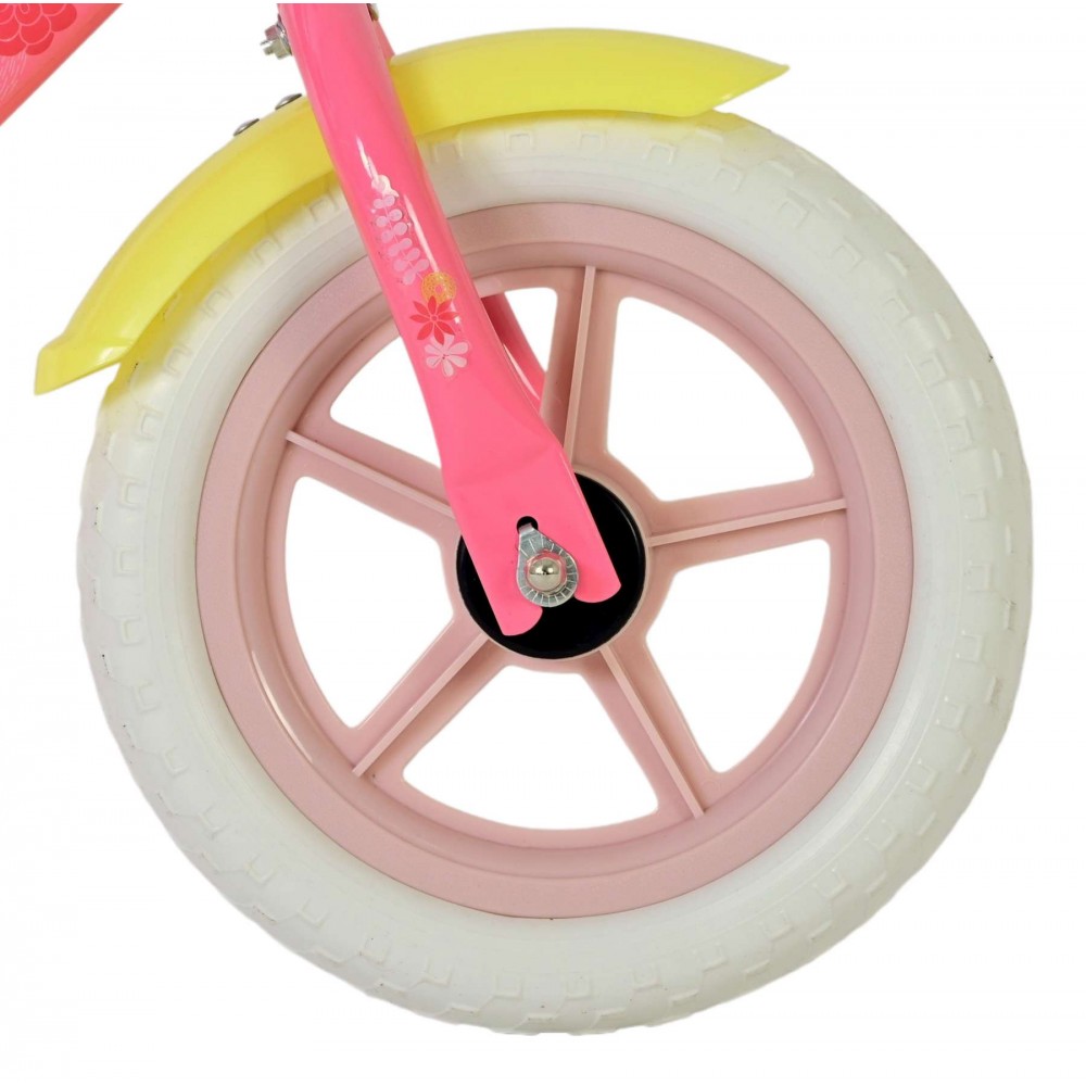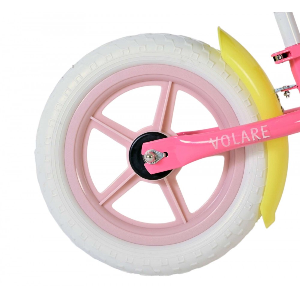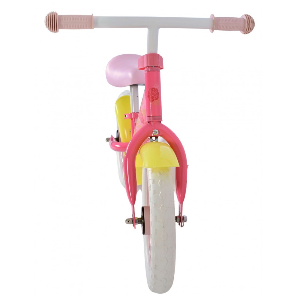 Deze lieve roze loopfiets is perfect voor kinderen van 1 tot 3 jaar die hun eerste stapjes in de fietswereld zetten. Met vrolijke gele spatborden en pastelroze velgen is deze fiets een echte eyecatcher voor elk avontuur in de straat of tuin.