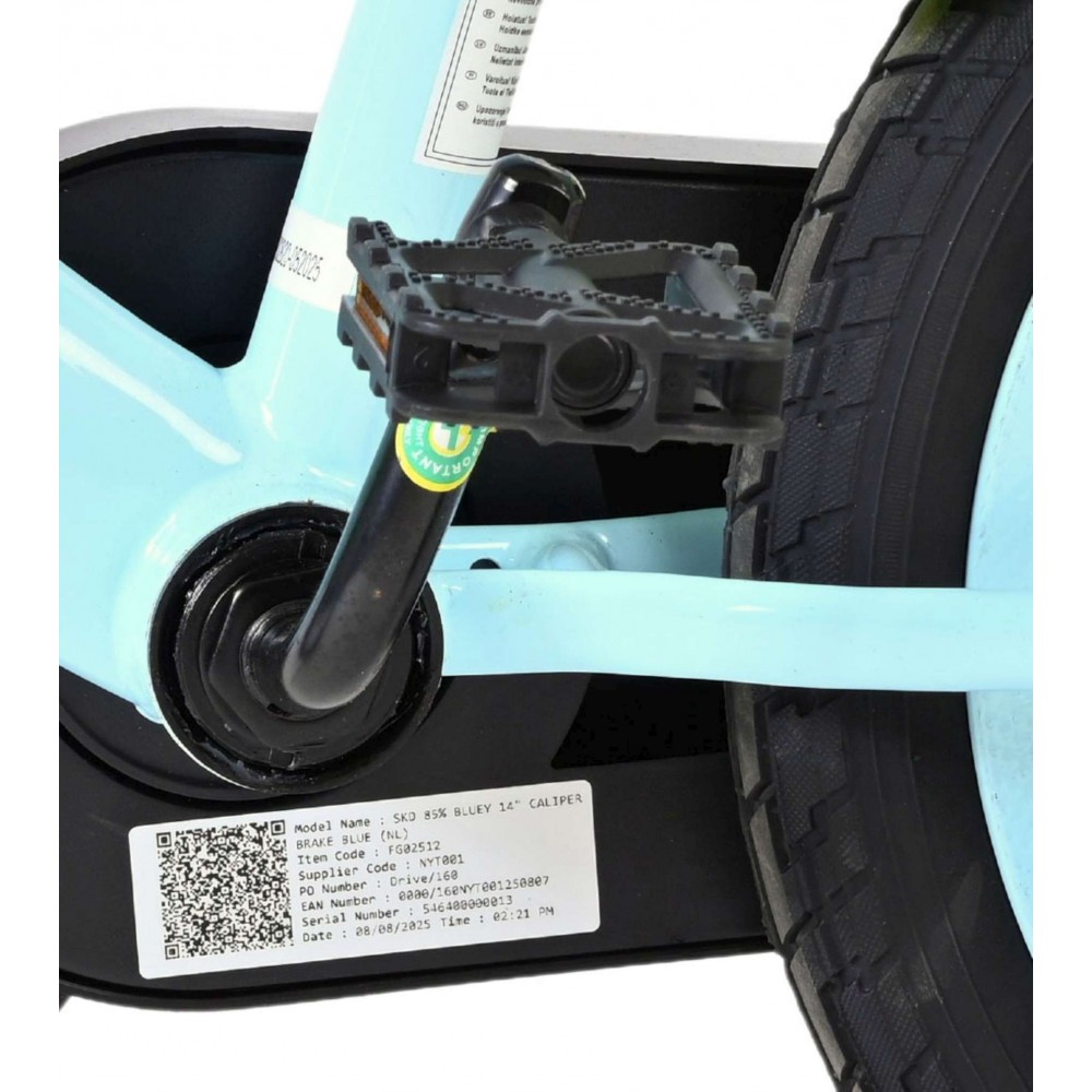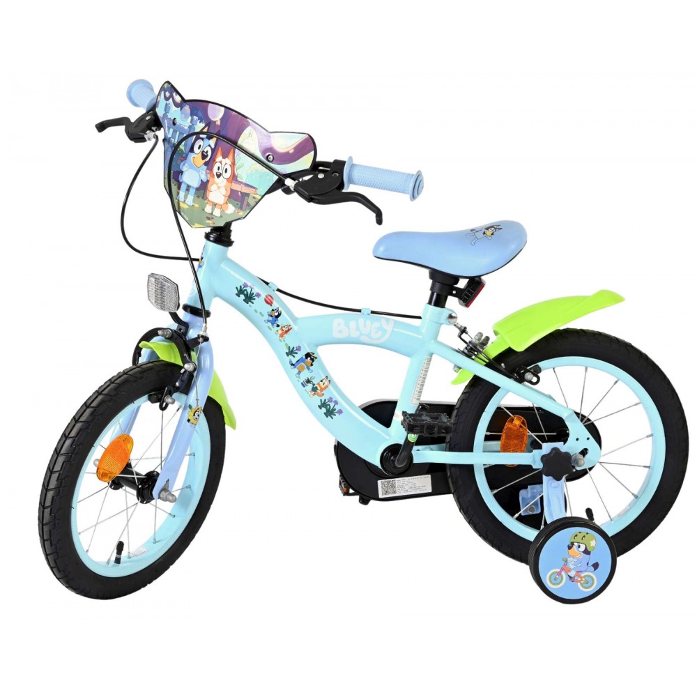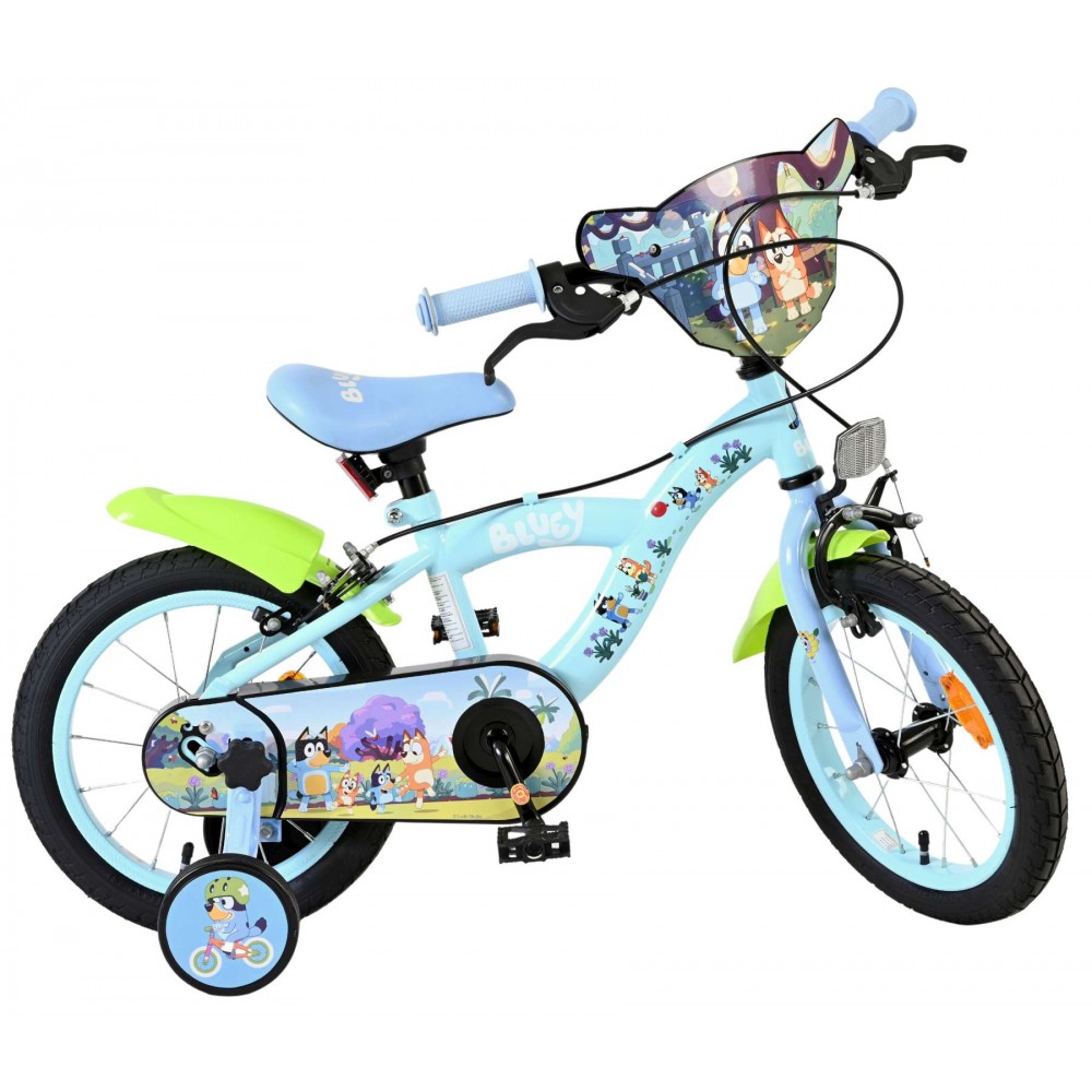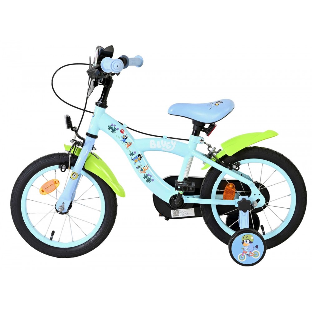 Voor jonge Bluey-fans die klaar zijn voor hun eigen fietsavonturen, is er de 14 inch Bluey kinderfiets van Volare! Deze vrolijke lichtblauwe fiets met neon groene spatborden springt meteen in het oog en is volledig in stijl van de populaire tv-heldin Bluey. Met kleurrijke prints op het frame én een stoer voorplaatje met Bluey’s gezicht is elke rit een feest vol herkenning en plezier.