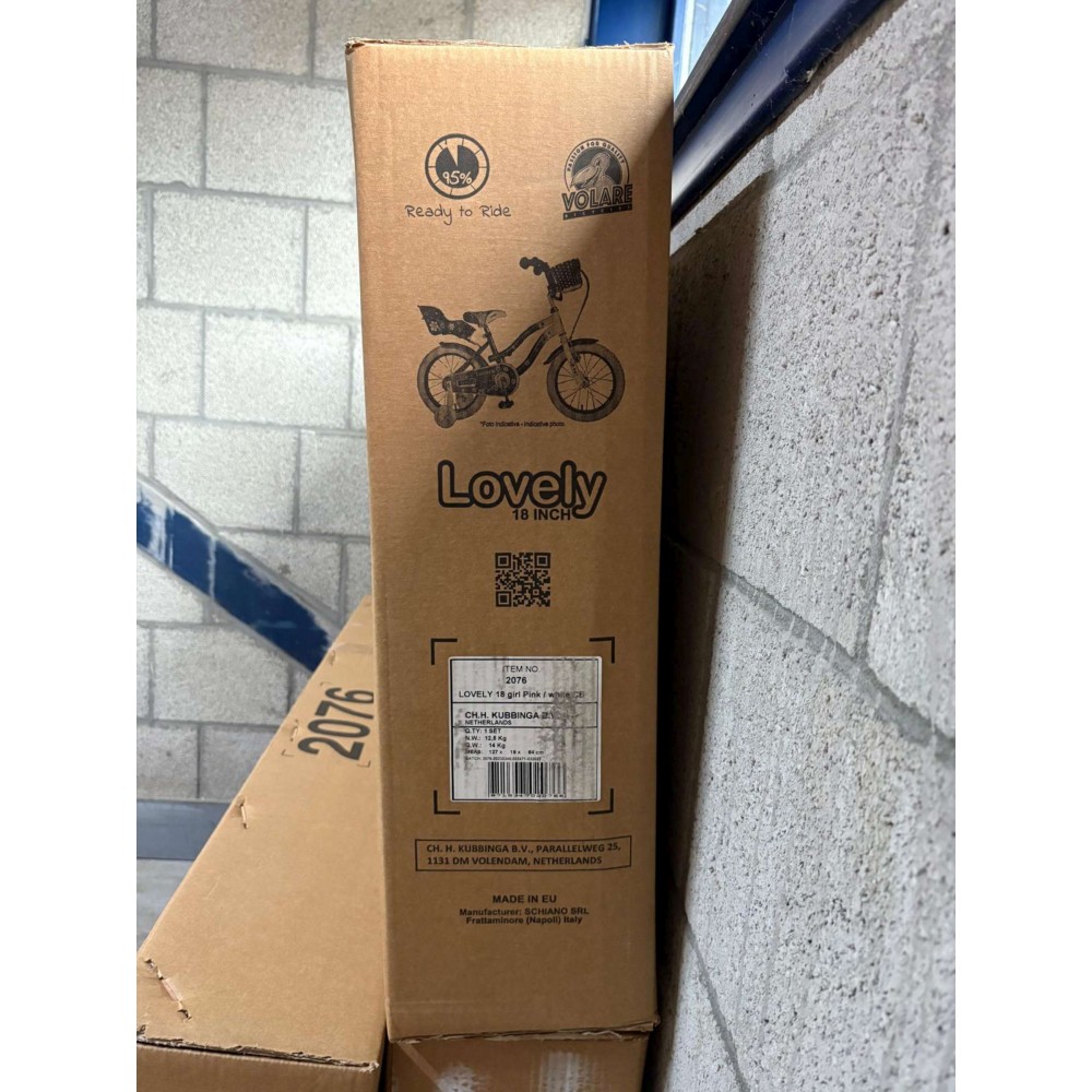 De Volare Lovely 18 inch kinderfiets is dé fiets waar ieder meisje van droomt. De vlinders en bloemen op het frame en zadel maken het design van de roze fiets helemaal af. Om vaart te kunnen minderen heeft de fiets zowel een handrem als een terugtraprem. Ter bescherming van de kleine vingertjes heeft de fiets een gesloten kettingkast. Met de fietsbel kun je laten weten dat je de hoek om komt. Om spulletjes mee te kunnen nemen heeft de fiets een prachtig kunststof mandje. Met de afneembare zijwieltjes kan ieder kind snel leren fietsen.